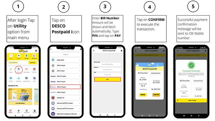 N.B: 1% of the DESCO Postpaid bill amount (Minimum BDT 5 or Maximum BDT 25) for payment from OK Wallet