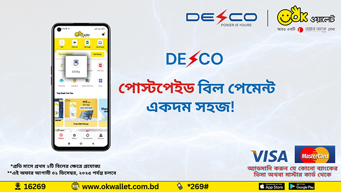 OK Wallet has launched DESCO Postpaid bill payment t facility for its valued customer. This service will enable customers to pay their DESCO Postpaid bill through personal OK Wallet Account, Agent points and also from any nearby branches of OBL branches through OK Wallet. This payment service will facilitate customers to pay their DESCO Postpaid bill through easy, fast, and secured procedure sitting anywhere in Bangladesh.
