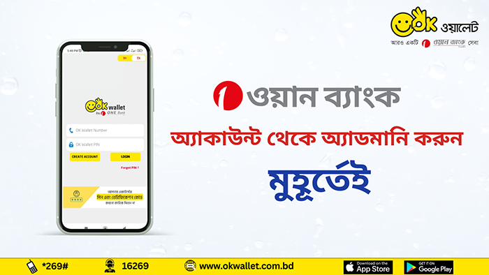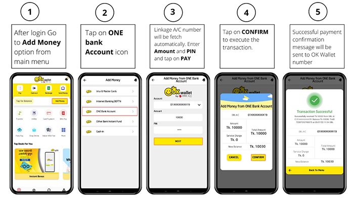 OK Wallet Customers can add money from ONE Bank Account instantly. This service will save time as well as make add money process smooth and convenient for OK Wallet customers.