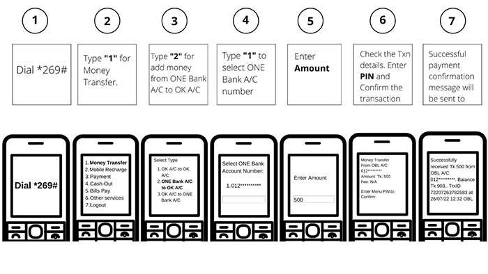 Process of adding money from linked OBL Account to OK Wallet using OK Wallet App and USSD: