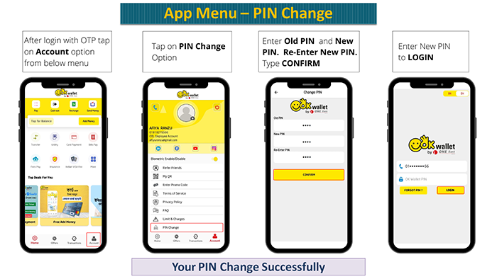 OK Wallet Customer can reset their OK Wallet PIN using OK Wallet App or USSD service by themselves. For ensuring the security of Customer’s OK Wallet Account, it is recommended that Customer will reset their OK Wallet Account PIN when they feel that it may have been compromised.